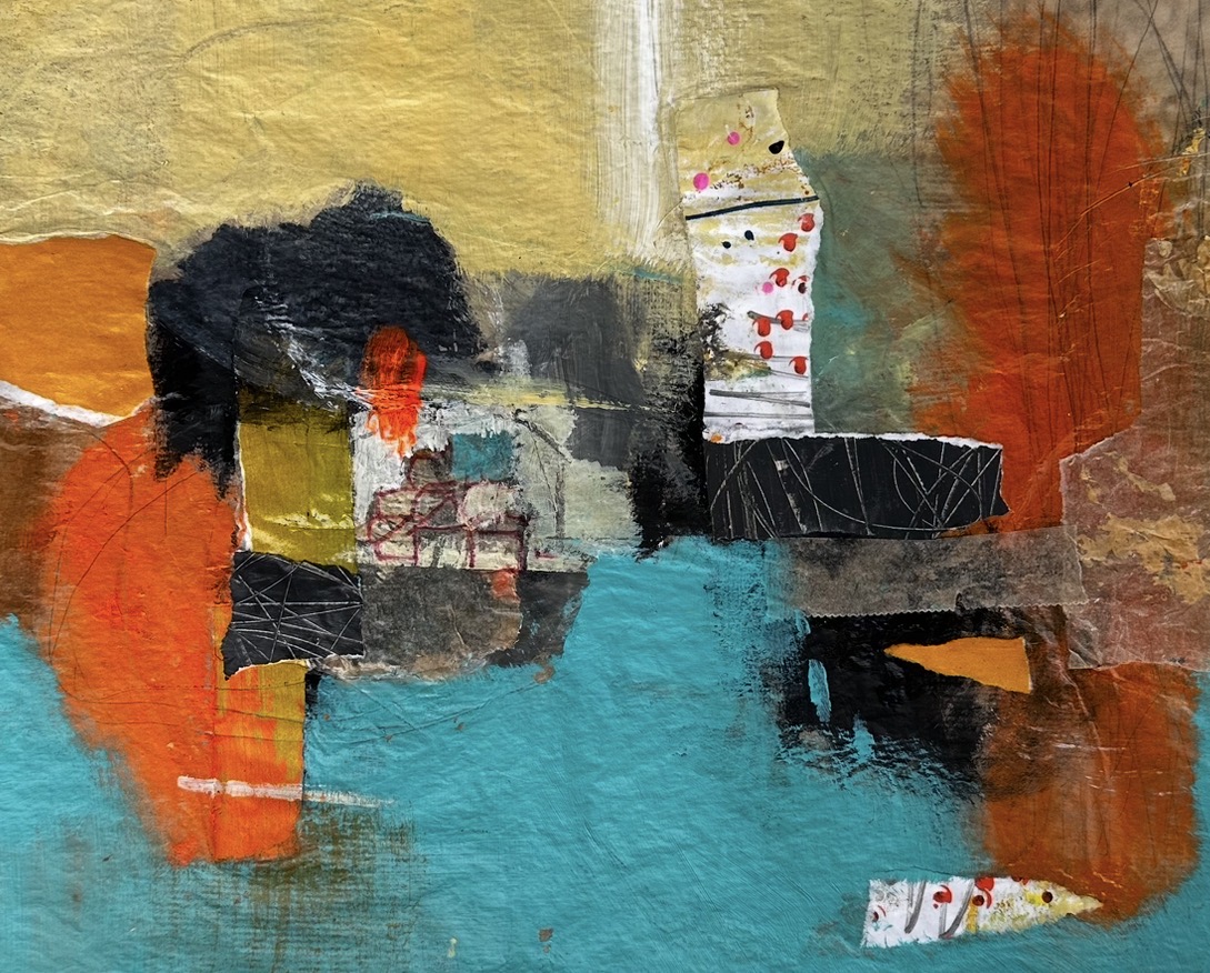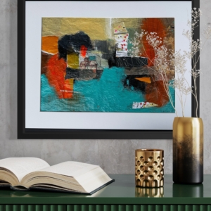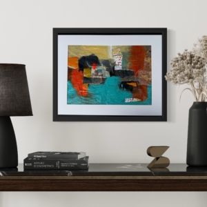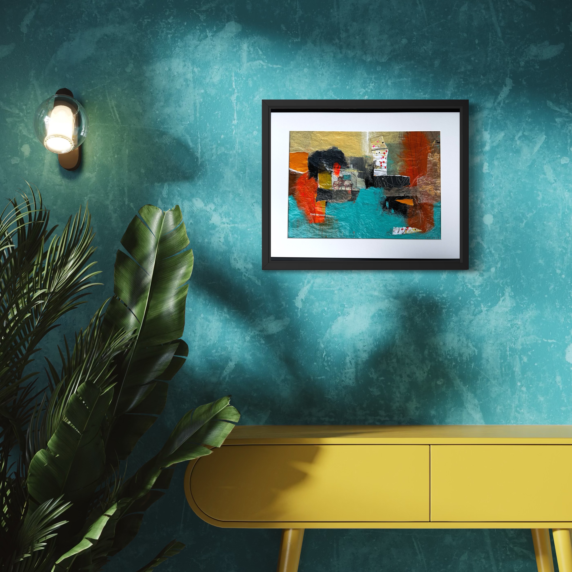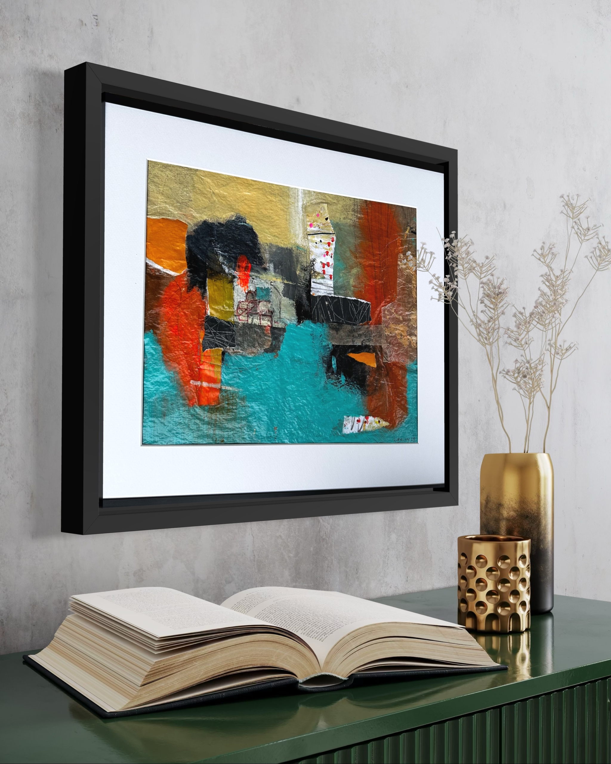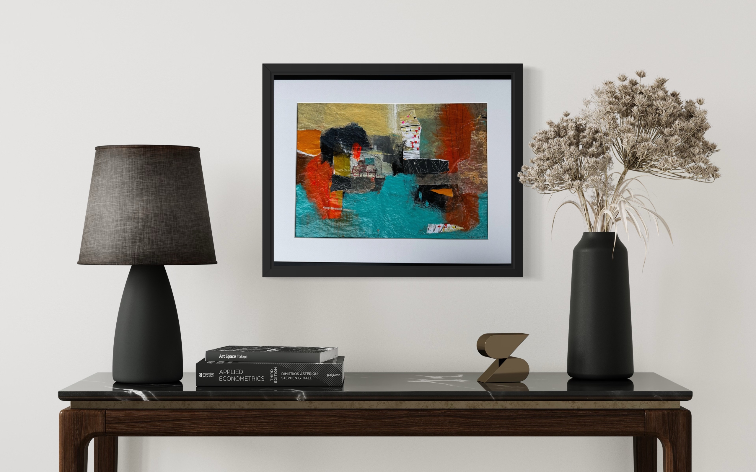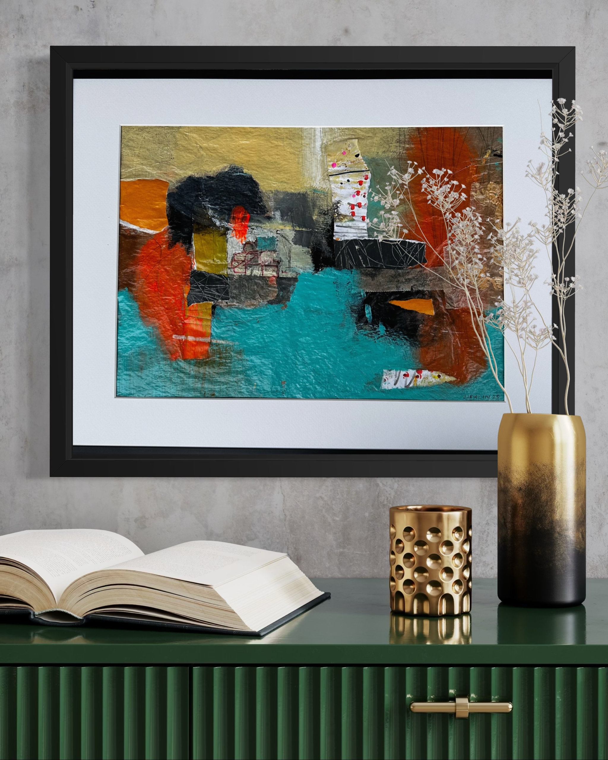 “Sea of Joy”, acrylic and collage on paper, 39 × 29 cm (framed 41 × 51 cm), 2025. “Sea of Joy” is a vibrant, contemporary artwork where bold colors blend with rich collage textures. A serene turquoise base meets expressive bursts of orange and red, creating a sense of movement and emotional depth. Layered paint, geometric shapes, and fine lines add structure and intrigue, balancing spontaneity with modern elegance.