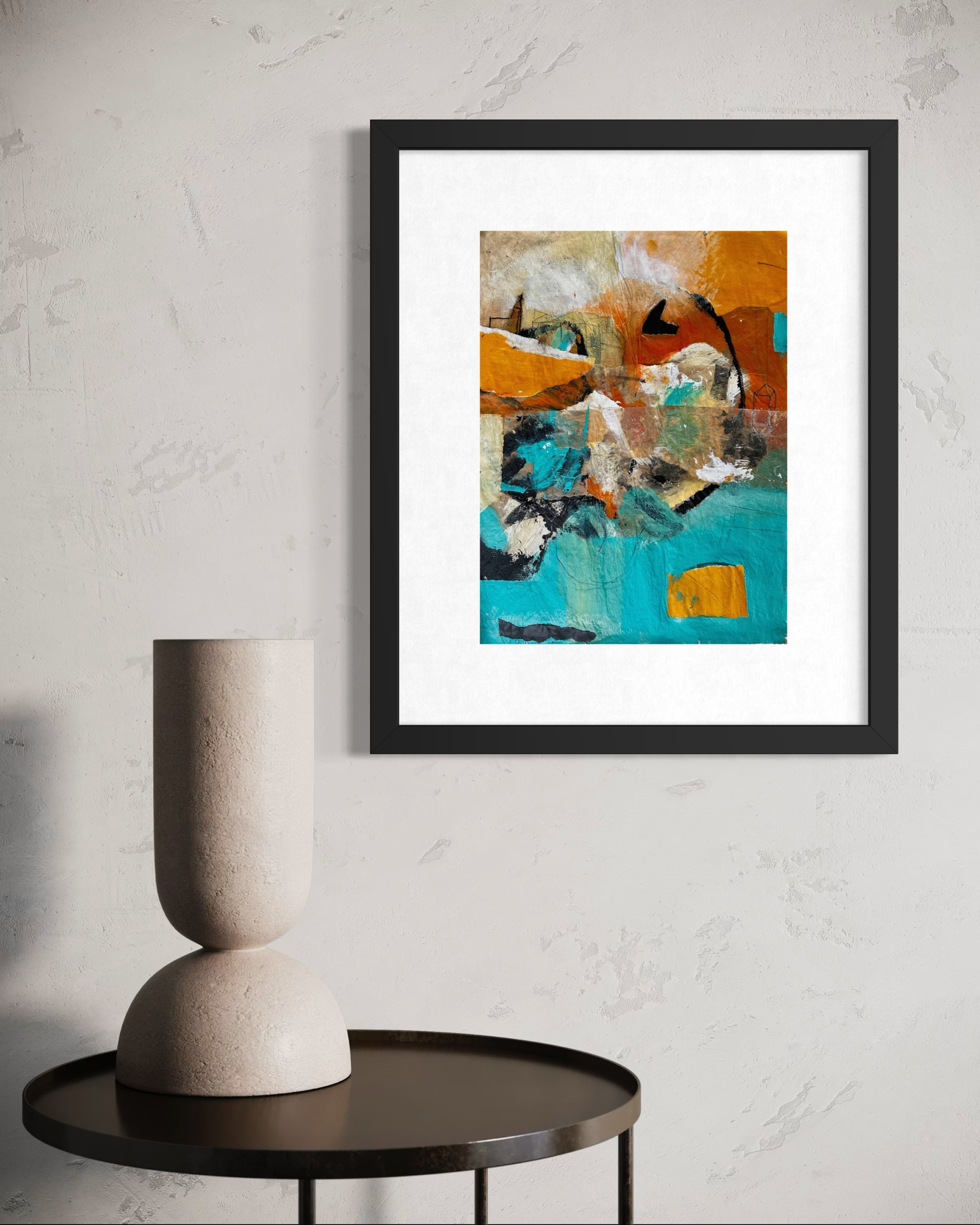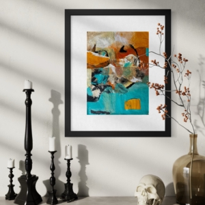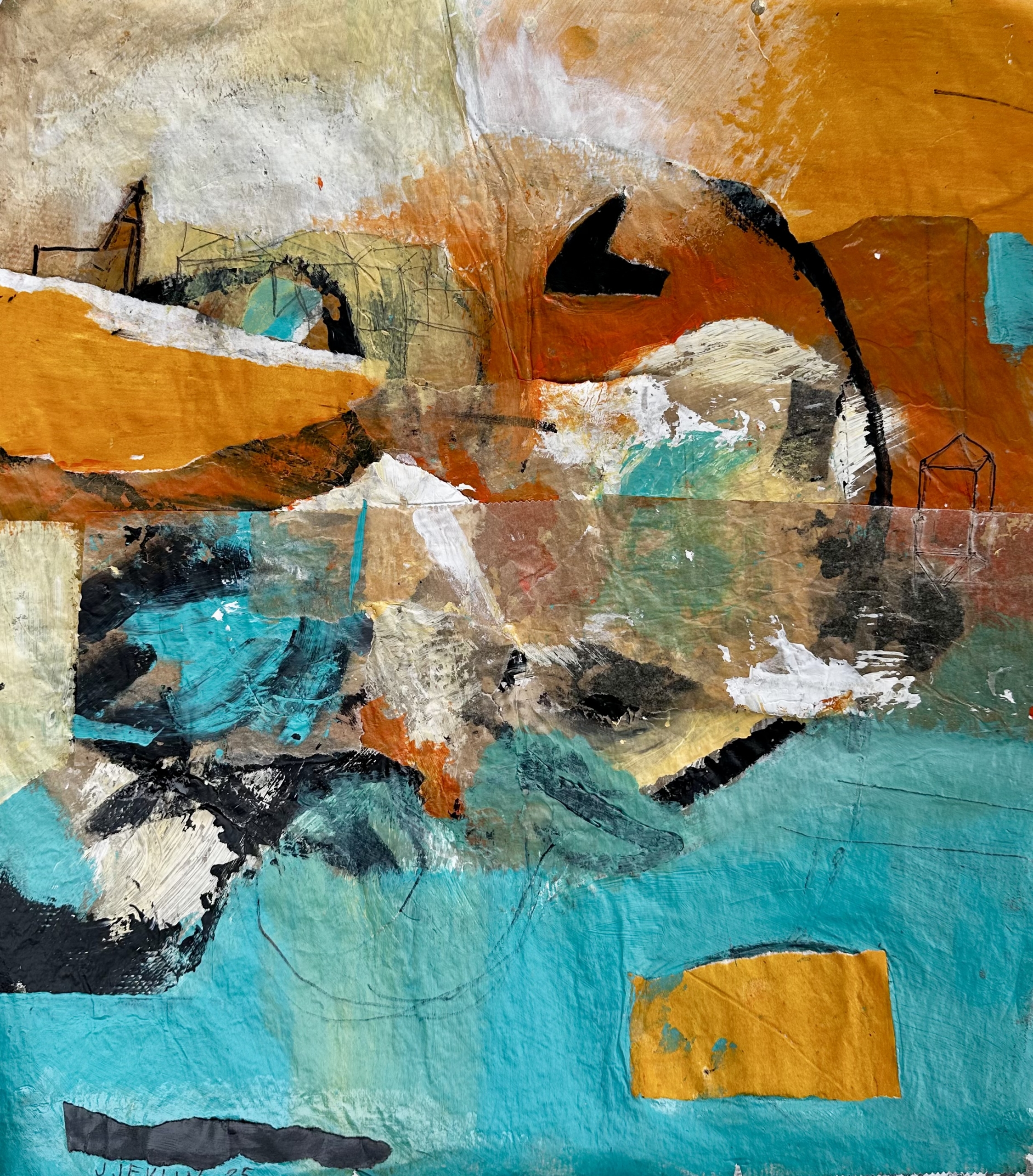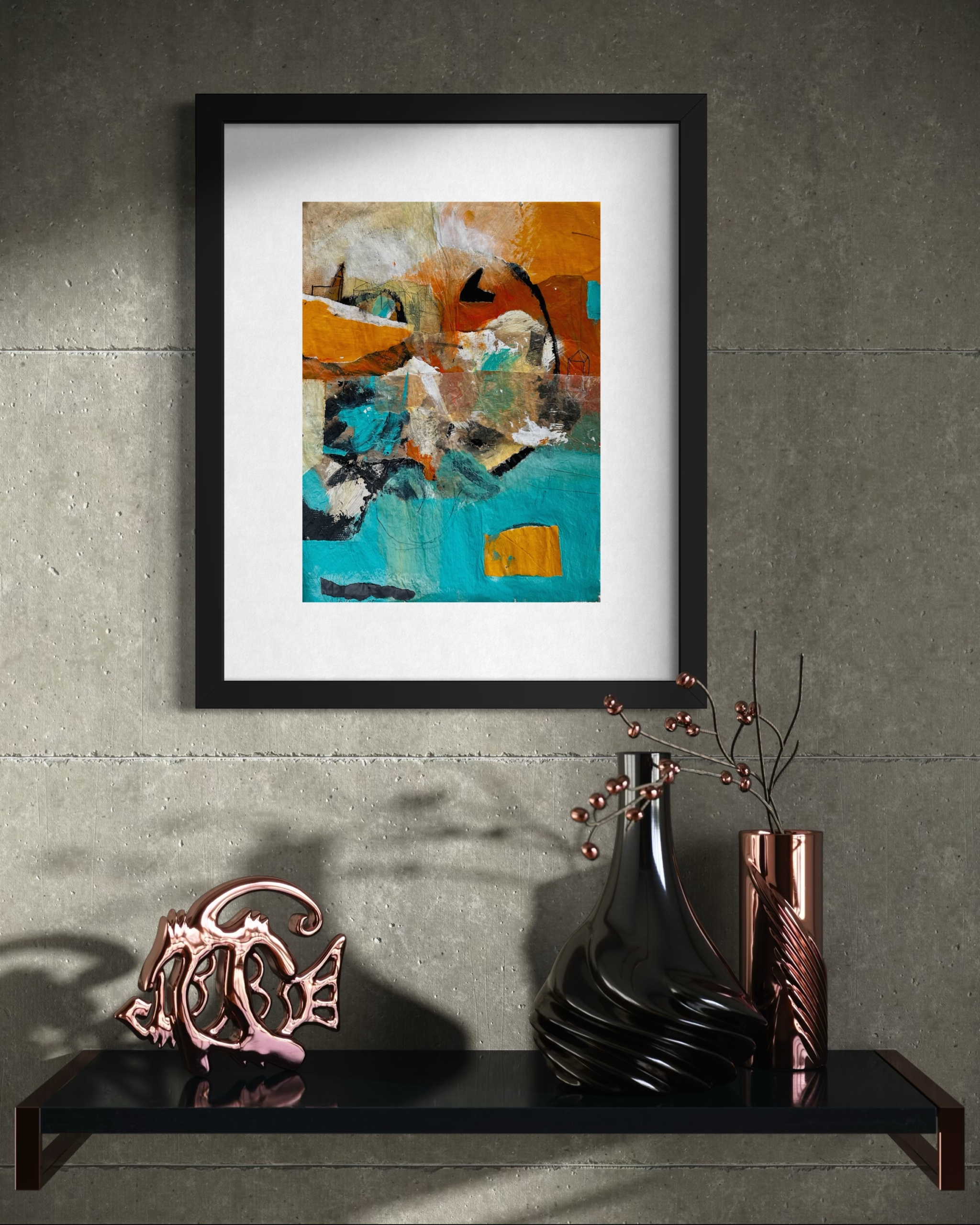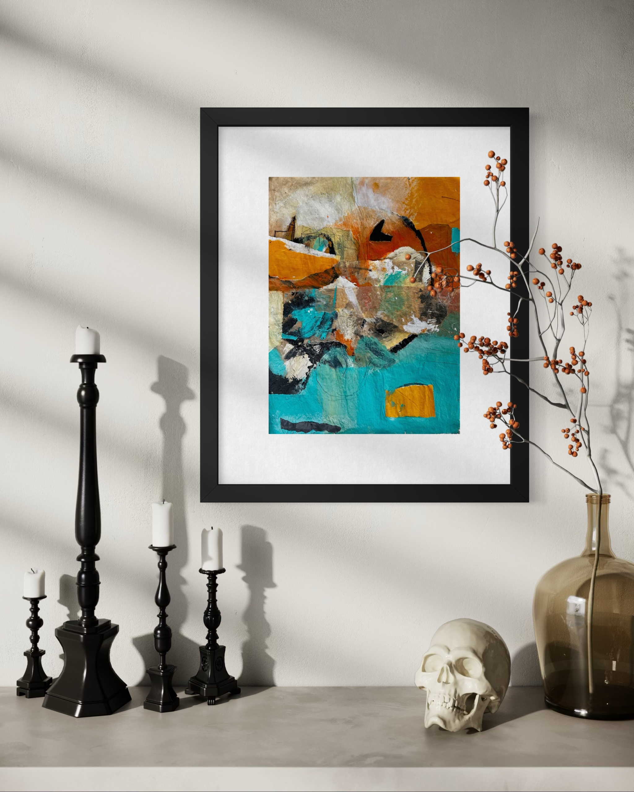 “Sea of Possibilities”  is a dynamic contemporary artwork combining vibrant turquoise tones with warm shades of ochre and white. Layered textures and energetic contrasts create a composition full of movement and expression. Raw collage elements and bold lines add depth and a unique character to the piece.