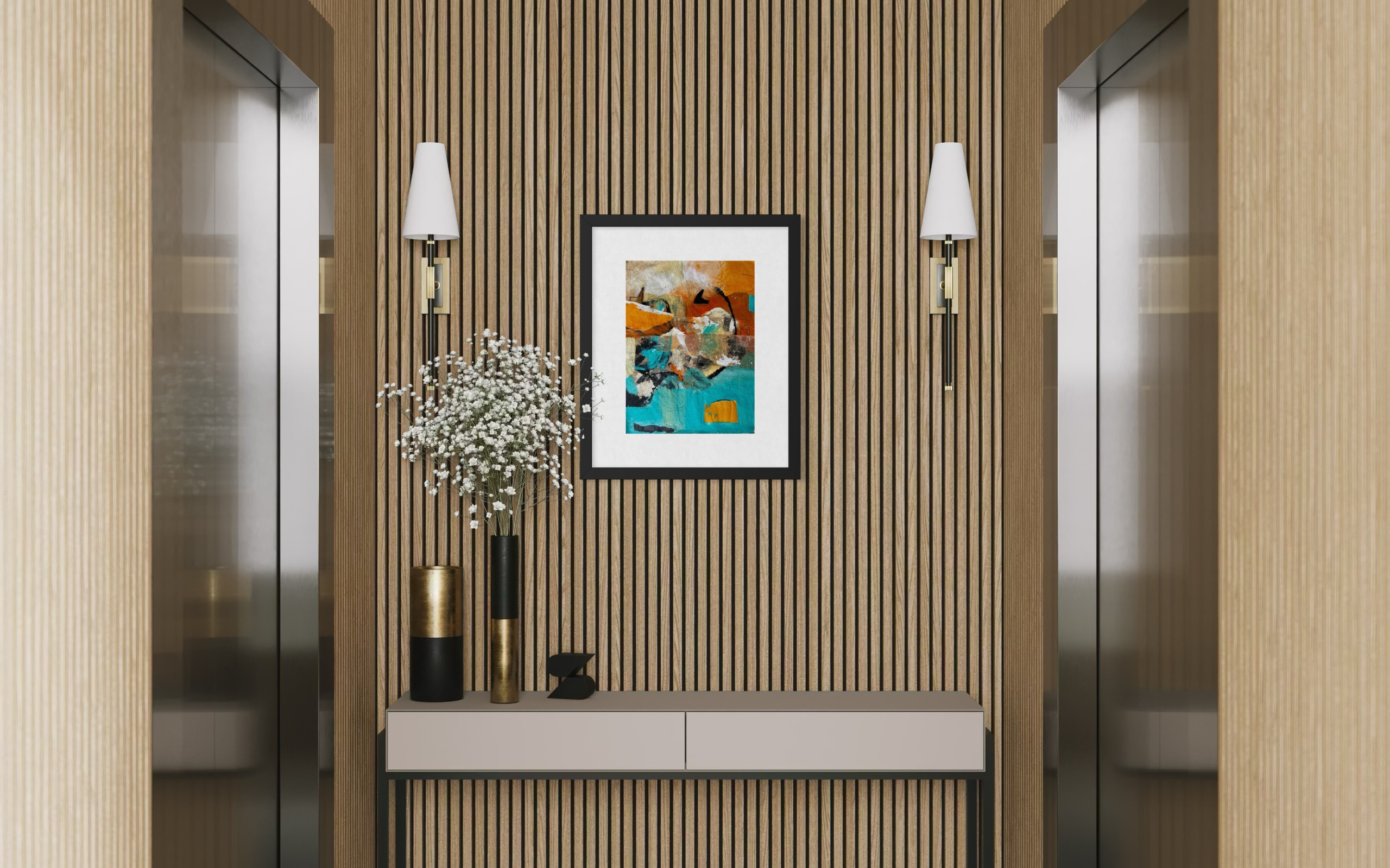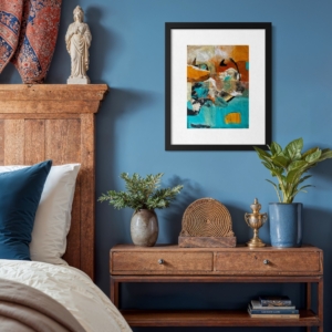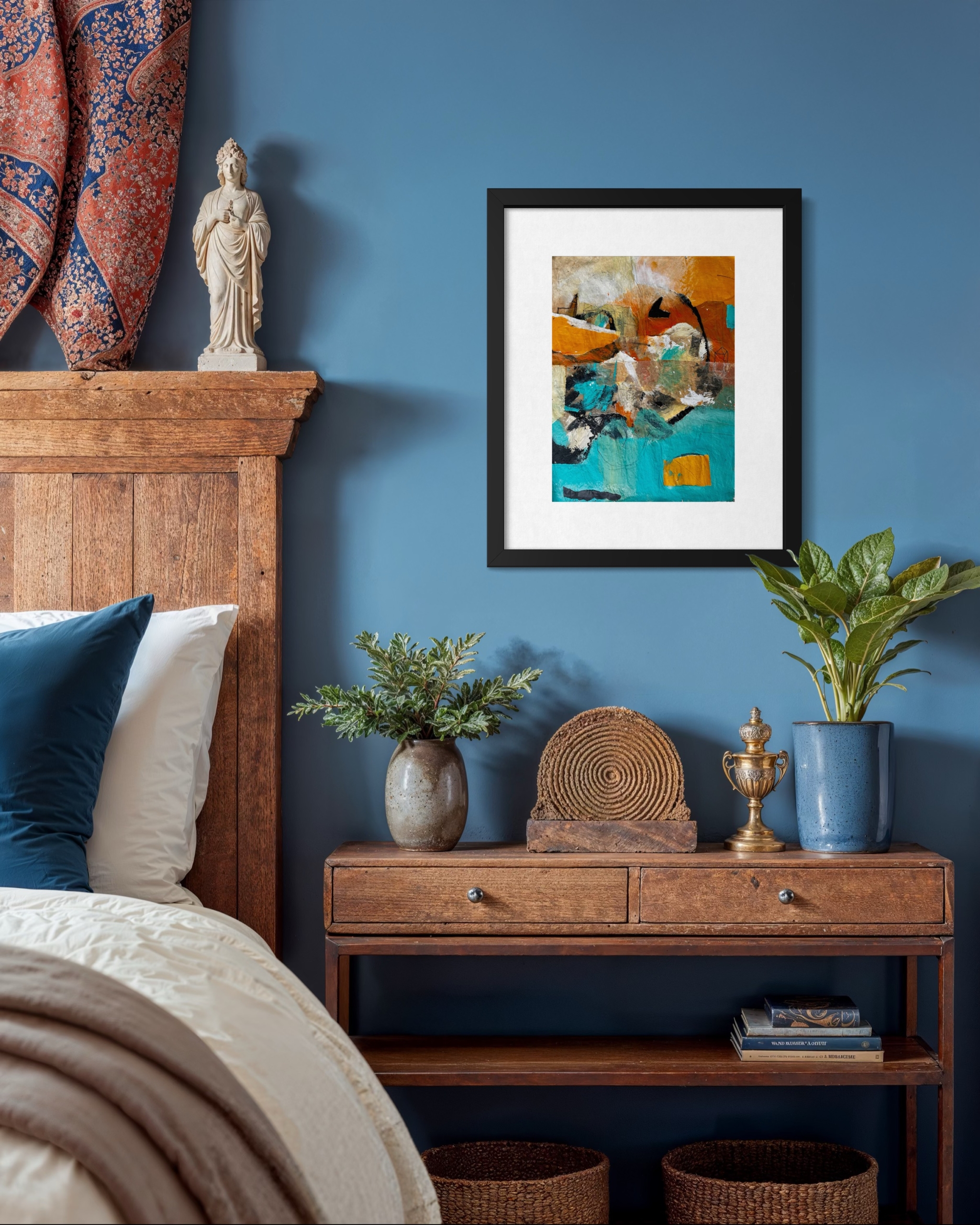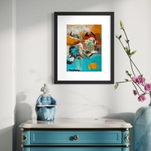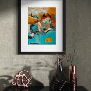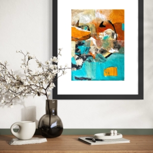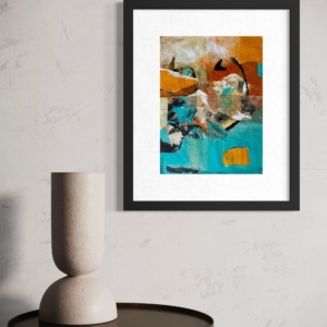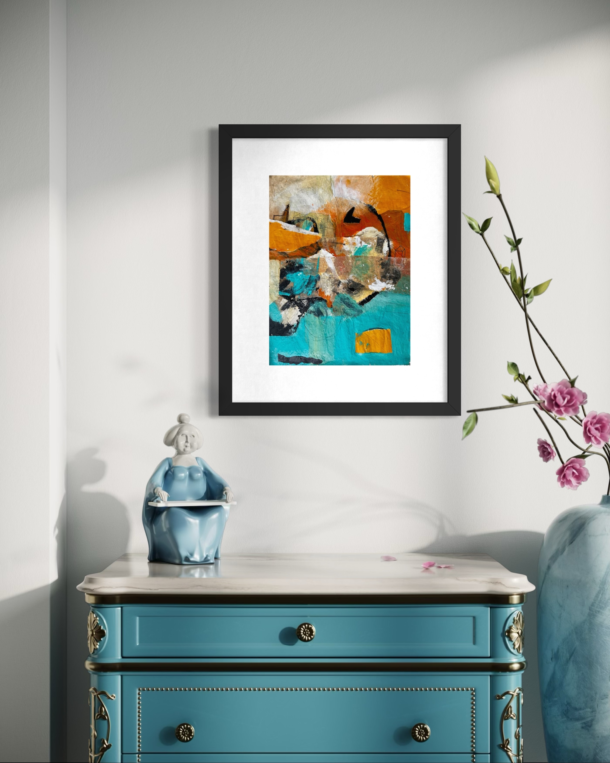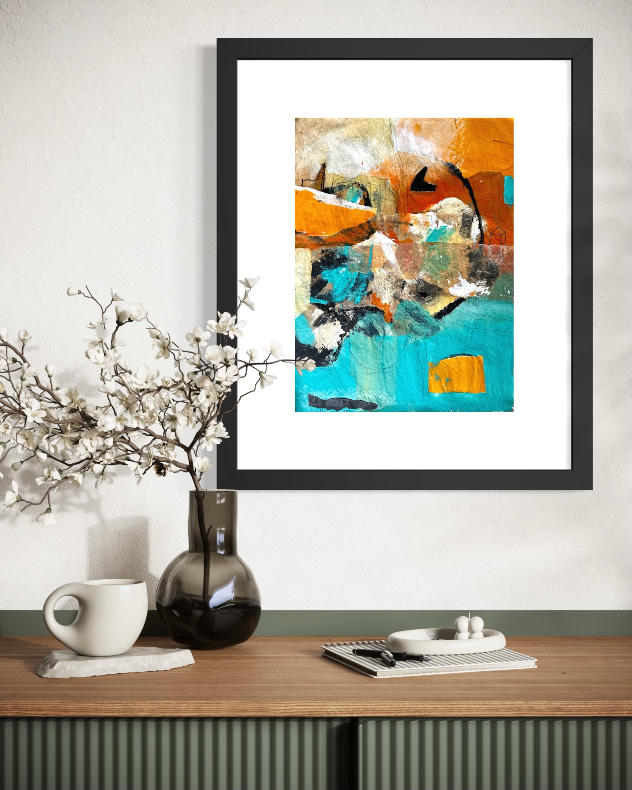 “Sea of Possibilities”  is a dynamic contemporary artwork combining vibrant turquoise tones with warm shades of ochre and white. Layered textures and energetic contrasts create a composition full of movement and expression. Raw collage elements and bold lines add depth and a unique character to the piece.