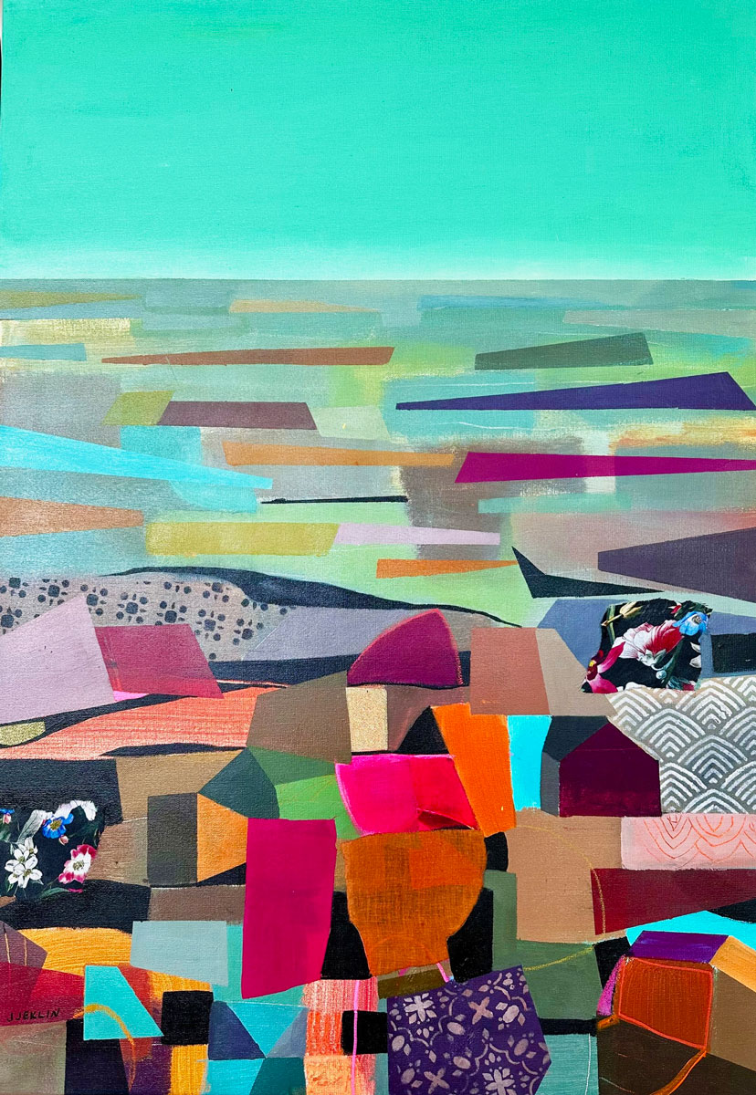 „Fragment Topografii” , wykonany w technice akrylu na płótnie, stanowi fascynujące studium abstrakcyjnego krajobrazu. Artystka dekonstruuje klasyczne postrzeganie terenu, zamieniając go w dynamiczną mozaikę barwnych płaszczyzn i geometrycznych form. Kompozycja zachwyca bogactwem faktur oraz odważnym zestawieniem kolorystycznym. Dolna część płótna tętni energią nasyconych róży, pomarańczy i błękitów, które przeplatają się z misternymi, roślinnymi i geometrycznymi wzorami przypominającymi kolaż. Górną partię obrazu dominuje uspokajająca, świetlista tafla morskiej zieleni, tworząca efektowny kontrast z wielowarstwową strukturą „ziemi”.