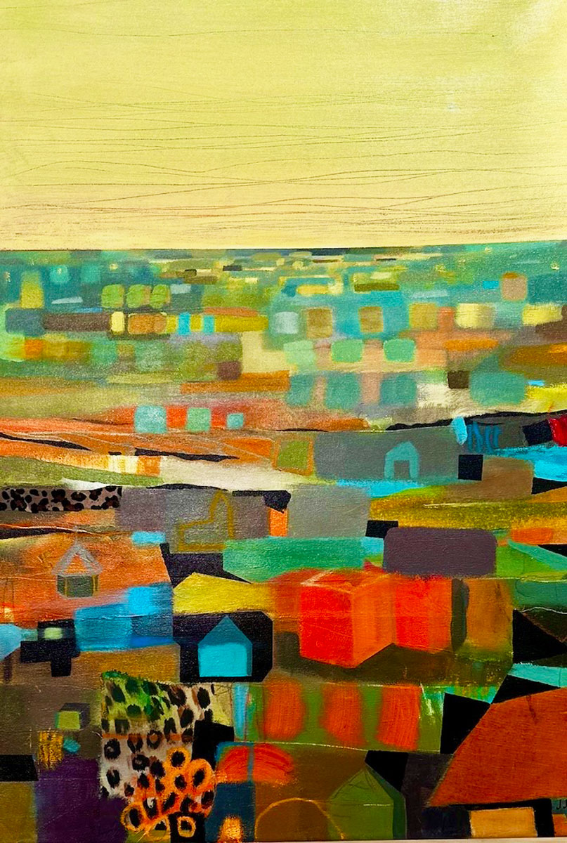 Mozaika Miasta, akryl na płótnie, tkanina, 100 x 70 cm, 2025