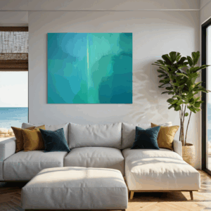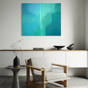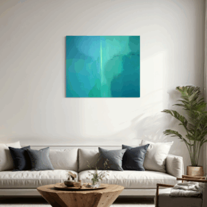 Kompozycja obrazu charakteryzuje się organicznymi, miękkimi formami, które płynnie przechodzą jedne w drugie. Warstwy akrylu nakładane są z lekkością, tworząc efekt głębi i przestrzenności. Dominująca paleta turkusów i zieleni przywodzi na myśl spokojne wody strumienia, bujną roślinność lub rozległe przestrzenie natury, widziane przez pryzmat emocji i wewnętrznego odczucia.
